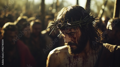 Jesus Christ walks the path to Calvary, burdened by the heavy cross and wearing the crown of thorns, his face etched with pain and sorrow, while the crowd of unbelievers jeers.