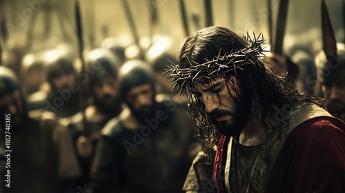 Jesus Christ walks the path to Calvary, burdened by the heavy cross and wearing the crown of thorns, his face etched with pain and sorrow, while the crowd of unbelievers jeers.