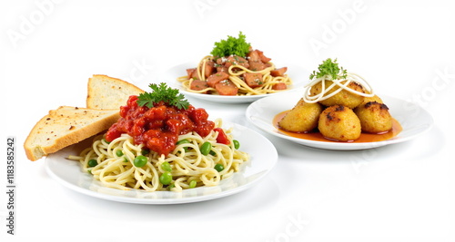 Jedzenie na białym tle. Pięknie skomponowane dania żywieniowe gotowe do wstawiania.