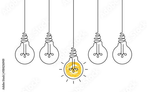 Hanging light bulbs with one glowing on white background. Continuous line drawing light bulb. Concept of idea