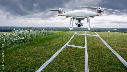 Bezpilotny aparat prowadzi kartografię terenu z powietrza w pięknym krajobrazie z chmurami w tle
