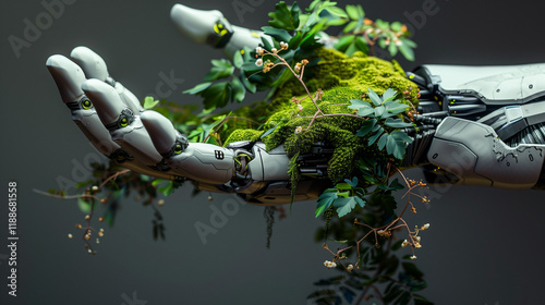 A robotic hand overgrown with lush moss and delicate blossoms, symbolizing the unexpected harmony between technology and nature
