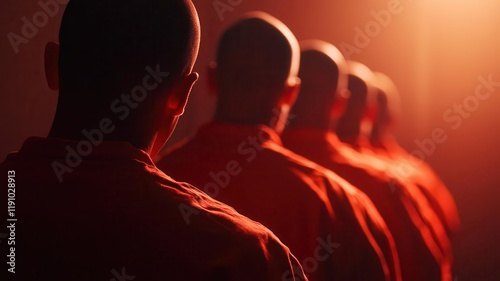 Inmates being processed in a facility intake room, highlighting the beginning of incarceration and the jail system