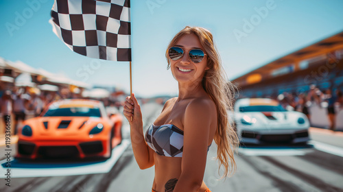 A cheerful woman poses with a checkered flag during a dynamic motor racing event amidst bright daylight and vibrant surroundings. The background shows sports cars and a lively, enthusiastic crowd.