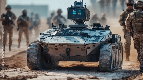 Military Personnel Walking Beside a Military Robot on a Mission.