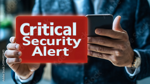 Critical Security Alert: A person in a business suit holds a sign displaying "Critical Security Alert," emphasizing urgency and the need for immediate attention.