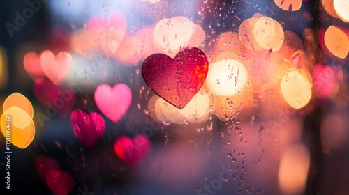Colorful heart shapes create a romantic atmosphere on a rainy day in the city during the evening