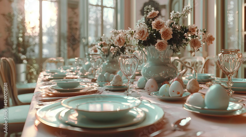 Stół wielkanocny zastawiony szkliwem, widoczne kolorowe jajka