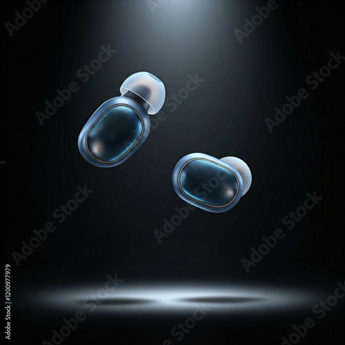 floating wireless earbuds in dark studio with blue and black colors and a dramatic spot light