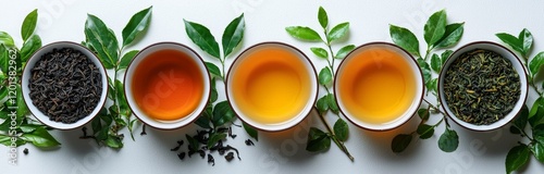 An arrangement focused on Asian food, including green tea, tea cups, a teapot, and bamboo branches