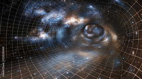 Cosmic wormhole tunnel through space-time continuum with galaxies.