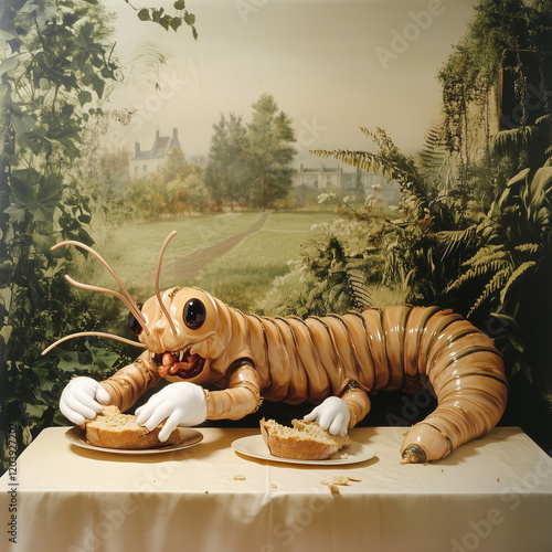 Gigantyczna larwa, owad, robak, motyl, zjada posiłek siedząc przy stole niczym człowiek, zabawna ilustracja