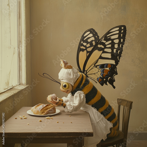 Gigantyczna larwa, owad, robak, motyl, zjada posiłek siedząc przy stole niczym człowiek, zabawna ilustracja