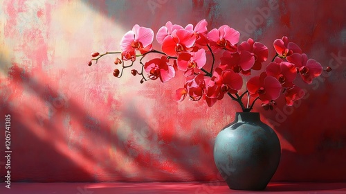 A vase of red flowers sits on a red background