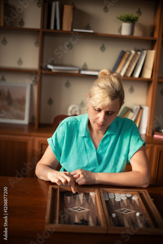 A woman in a turquoise shirt is playing backgammon on a wooden board in a cozy indoor setting, focusing on moving a black piece, with a warm, sunlit background and bookshelves behind her.