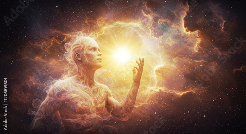 Artistic illustrations that represent the human conscious and universe in a spiritual and divine manner.