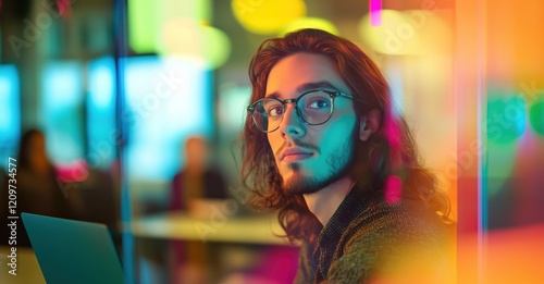 Un homme aux cheveux longs, portant des lunettes, assis devant un ordinateur portable, regardant de côté, salle de conférence ou de réunion avec des collègues flous en arrière-plan et lumière colorée.