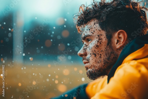 A football player sitting on the sidelines, looking dejected after losing the match, with mud-stained clothes and an empty field behind them
