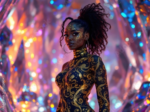 Vibrant cosmic fashion model with sparkling face art amidst iridescent background
