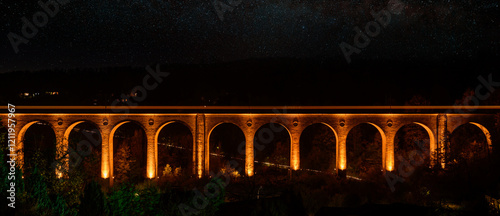 Panorama view of “Bekeviadukt“ bridge in Altenbeken Germany from 1853. Double track bent limestone railway viaduct on the main line Paderborn Warburg.