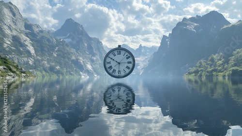 A floating clock in the middle of a peaceful mountain landscape, reflecting the passage of time