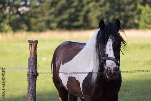 Koń w biało bązowe łaty stoi na letniej łące za ogrodzeniem z drutu