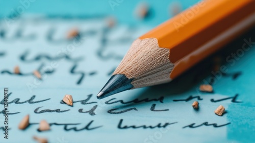 Explore a detailed sketchbook page featuring artistic handwriting alongside imaginative pencil sketches and shading Discover the beauty of creative expression with this close-up view of a page filled