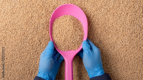 Hands in blue gloves holding pink scoop with sesame seeds background