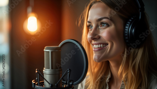 Woman in soundproof room prepares for voice recording session. Focused on pro vocal delivery for dubbing voiceover. Smiling, looks attentive to recording material. Studio environment enhances vocal