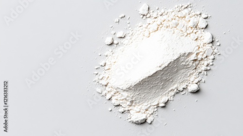 White powdery substance is spread out on a white surface. The powder is white and he is flour