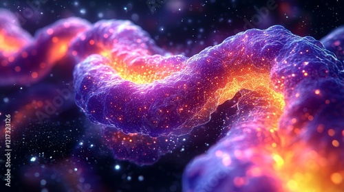 A detailed look at abstract cellular formations painted in bright neon tones, featuring sophisticated patterns reminiscent of alien terrains, capturing a scientific elegance