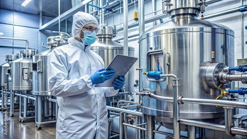 Person in a cleanroom suit working with a stainless steel tank in a laboratory setting. Emphasizes safety and precision in pharmaceutical or biotech processes.