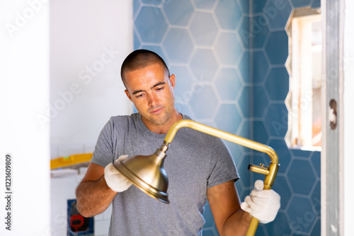 Skilled workman wearing ordinary clothes repairing shower head in bathroom at house