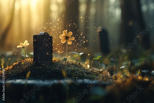 A mysterious figure planting seeds in an overgrown graveyard, with small glowing flowers sprouting from the earth, symbolizing rebirth and hidden benefits in unlikely places