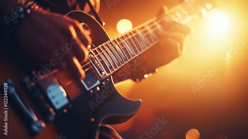 Primer plano de manos tocando guitarra eléctrica en un concierto
