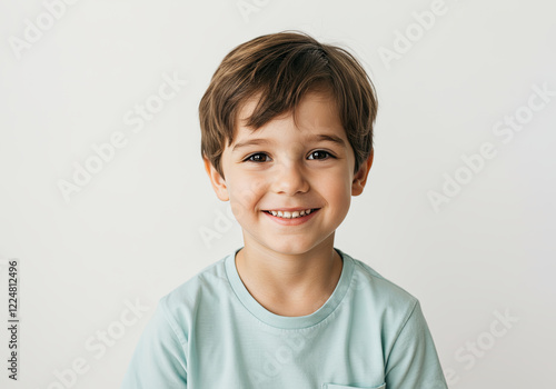 Portrait of a laughing boy of 6-7 years old in a T-shirt on a light background