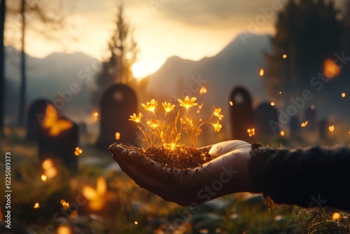 A mysterious figure planting seeds in an overgrown graveyard, with small glowing flowers sprouting from the earth, symbolizing rebirth and hidden benefits in unlikely places
