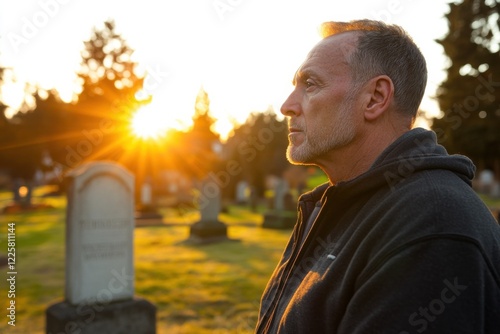 Man reflects quietly in a cemetery during sunset as light casts warm tones across the memorial stones and surroundings