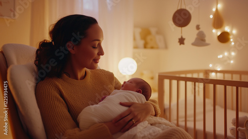 Young Mother Cradling Newborn in Peaceful Nursery Setting