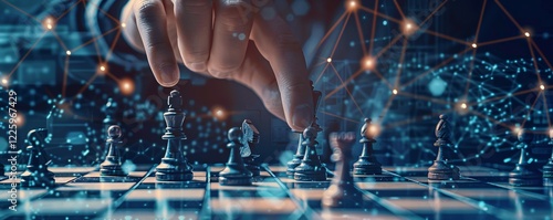 Strategizing for business success: hand moving chess piece on network grid chessboard