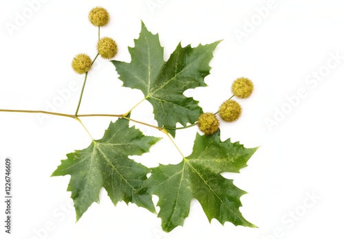 Close-up of London Plane Tree platanus hispanica Leaves and Spherical Fruits on White Background