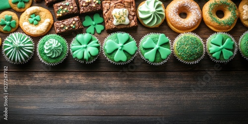 A row of green cupcakes and donuts on a wooden table. The cupcakes are decorated with shamrock designs and the donuts are covered in green frosting. Scene is festive and celebratory, likely for St