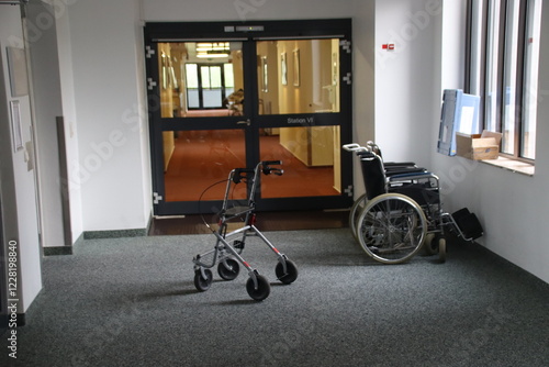 Rollstuhl, Rollator oder Gehhilfe auf einem Flur in einem Altenheim stehend
