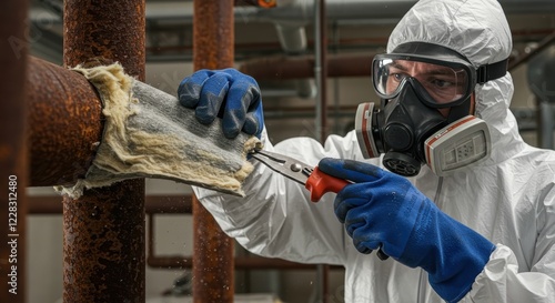 Hazmat professional removing asbestos from rusty pipes in industrial setting