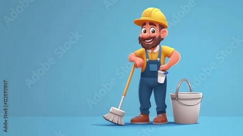 Clean and Cheerful: A friendly cartoon janitor in a yellow hard hat and blue overalls stands proudly with a mop and bucket.