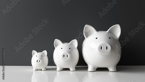 Three white piggy banks of varying sizes are lined up against a dark background, symbolizing savings and financial growth.