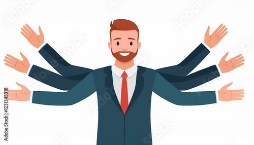 Business man with arms raised. Happy businessman with many hands Vector illustration in flat design. isolated on white background.