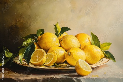 A Still Life Painting of Lemons and Leaves