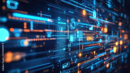 Concept of AI marketing automation, represented by a digital interface with floating data, charts, and algorithm icons.
