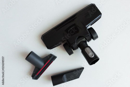 Set of black plastic brushes and nozzles for vacuum cleaner. White background.